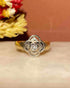 Son anneau est façonné en or jaune 18 carats et platine finement travaillé.