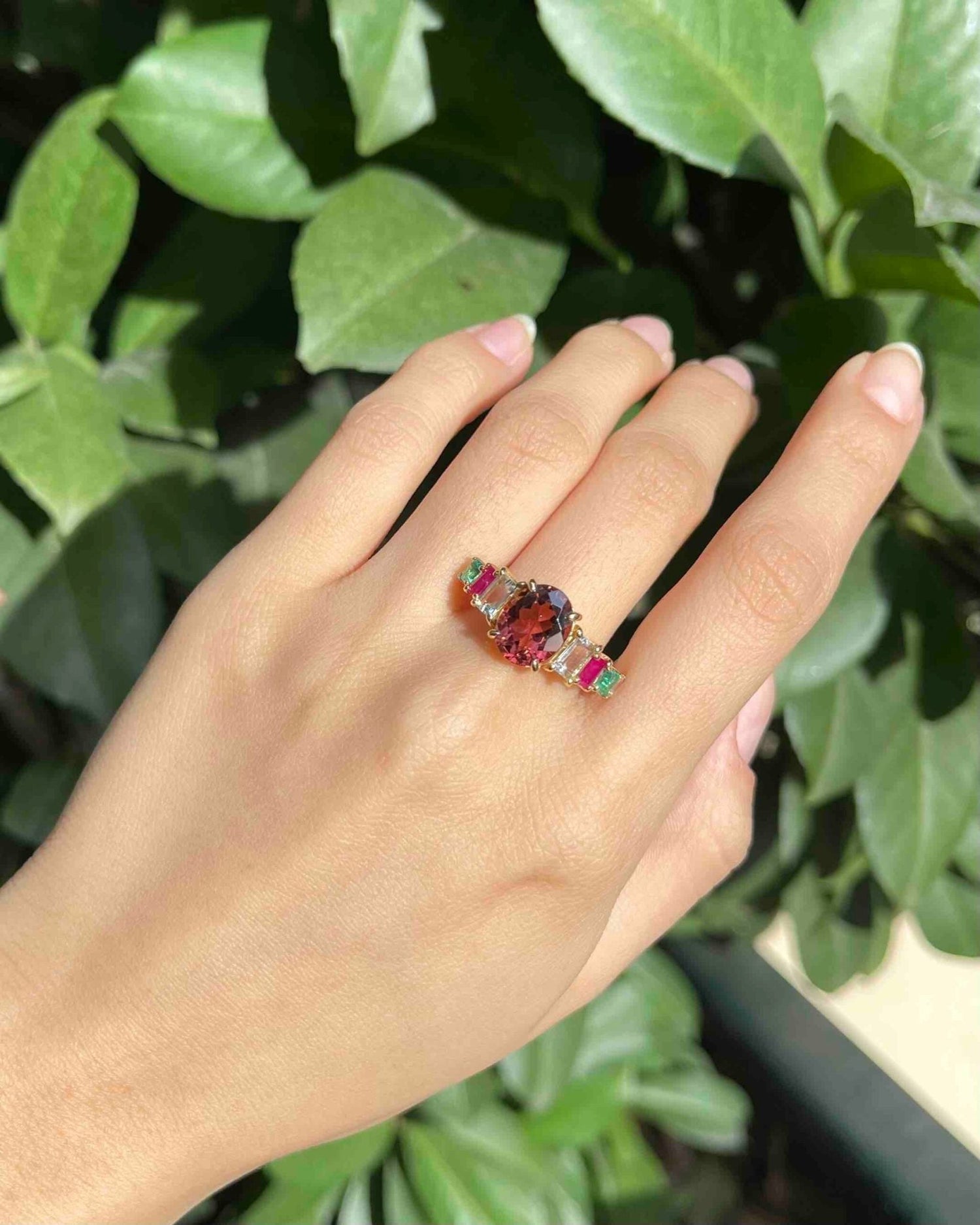 En son coeur une tourmaline de 3 carats. Encadrée de deux Aigues-marines cristallines, deux Rubis rouge flamboyants, deux Émeraudes vertes hypnotisantes et deux diamants taille princesse.