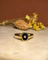 Un cerclage d’or retient une envoûtante plaque d’onyx, qui contraste avec son diamant étincelant de lumière.