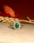Son coeur émeraude de 0.40 carat est entouré de quatorze pétales de diamants.